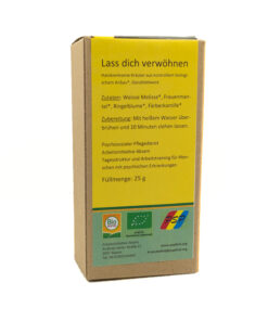 In dieser Mischung spielt die Weiße Melisse die geschmackliche Hauptrolle. Diese besondere Melisse hat schon Hildegard von Bingen gekannt und geschätzt, da es die heimische Melisse ist, während die Zitronenmelisse aus dem Mittelmeergebiet gekommen ist. Weiße Melisse ist komplizierter im Anbau, behält aber viel mehr Aromastoffe auch nach dem Trocknen. Der weiche Frauenmantel und die heilkräftige Ringelblume komplettieren die Komposition und die Färberkamille sorgt für den wunderschönen Farbton.